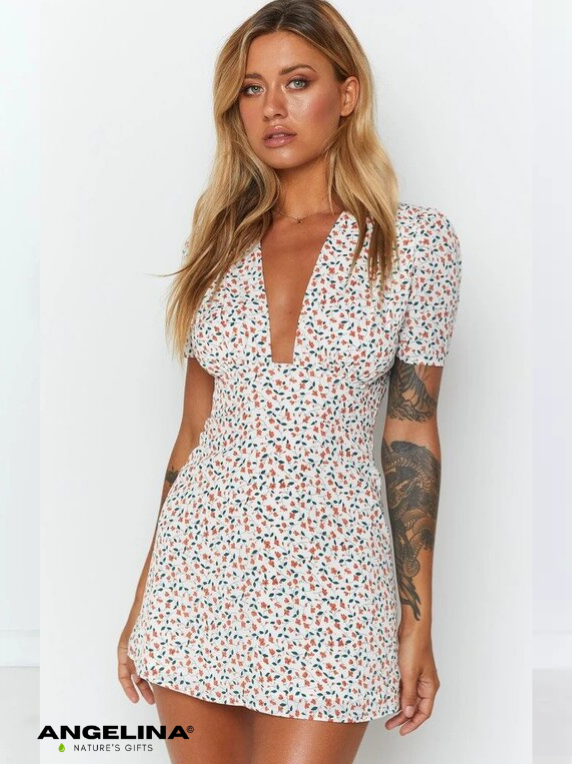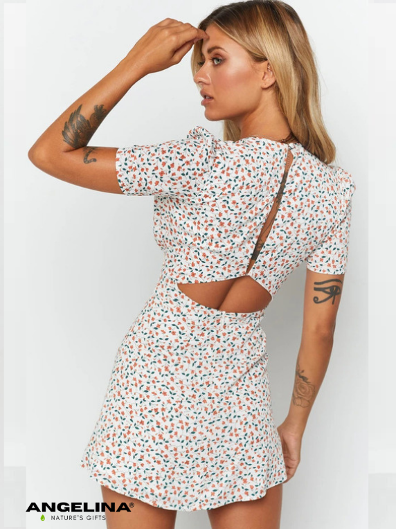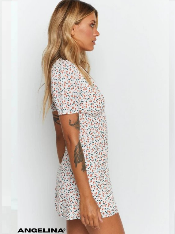 שמלת מיני פרחונית לבנה וכתומה צוללת מחשוף שרוולים קצרים חצאית אונליין קצרה גב מגזרת רוכסן בגב בלתי נראה כפתור וסוגר בגב (החלק העליון של הגוף) בד מרופד לחלוטין לא נמתח